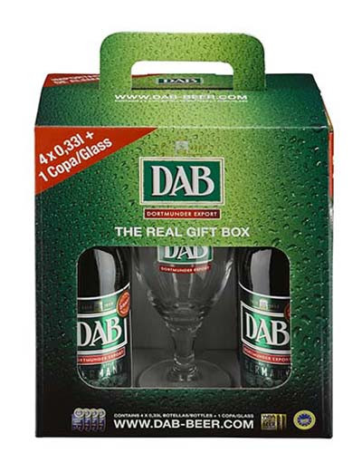 A DAB díszdobozban 4 üveg 0,33 l sör +1 db logózott pohár. DAB Lager az alsóerjesztésű, világos aranyszínű, német lager típusú sörök megtestesítője. Harmonikusan kiegyensúlyozott, friss és könnyen iható sör, megnyerő komló és maláta jegyekkel. Szépen lekerekített ízvilág selymes sima textúrával.