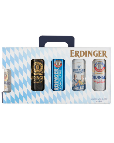 Erdinger sörválogatás: 4 x 0,5 l dobozos-  Erdinger Weissbier, Erdinger Hefe Dunkel, Erdinger Alkoholfrei, Brauhaus Helles, 1 db logózott búzasörös pohár.