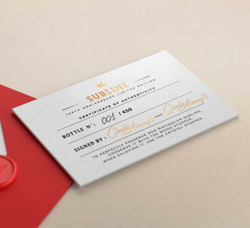 Az egyedi és megismételhetlen rumhoz készült certifikáton a Matusalem család alapítóinak negyedik és ötödik generációjának képviselői III. Claudio Álavrez és IV Claudio Álvarez saját kezű aláírása található.