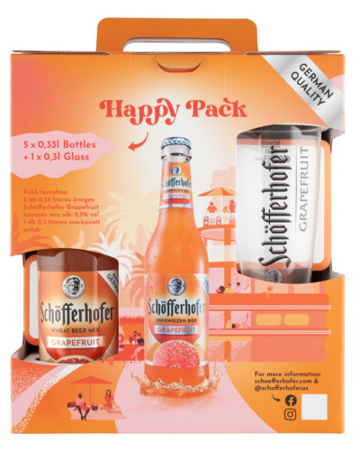 SCHÖFFERHOFER HAPPY PACK  Grapefruit mix 5 X 0,33 L üveges szűretlen búzasört +1 db logózott pohárral. Tökéletes párosítás, amelyben a szelíden pezsgő Schöfferhofer búzasör aromái, a nap érlelte grapefruit citrusos zamataival összeolvadva egy igazi nyár-feelinget igéző trendi frissítő.